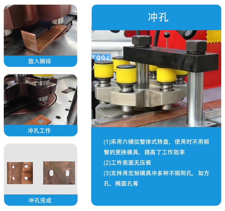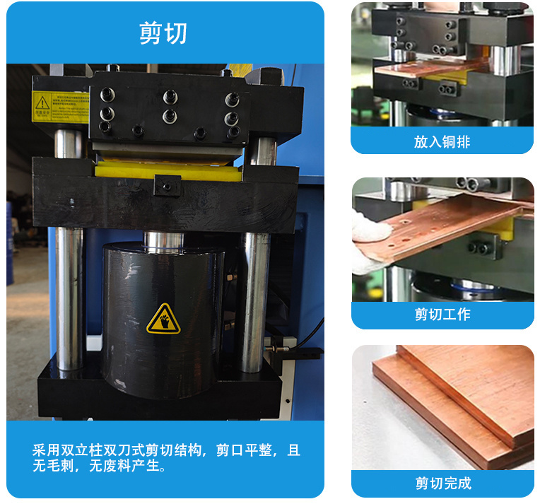| 冲孔、剪切工位带有手动定位挡尺,可对铜排进行精准定位,工作过程中无需划线,大大提升了工作效率和加工精度。 | 配有自动加油功能。采用三台电机,分别对应冲孔、剪切和折弯位,确保三工位功率稳定,各司其职,互不干扰。 |