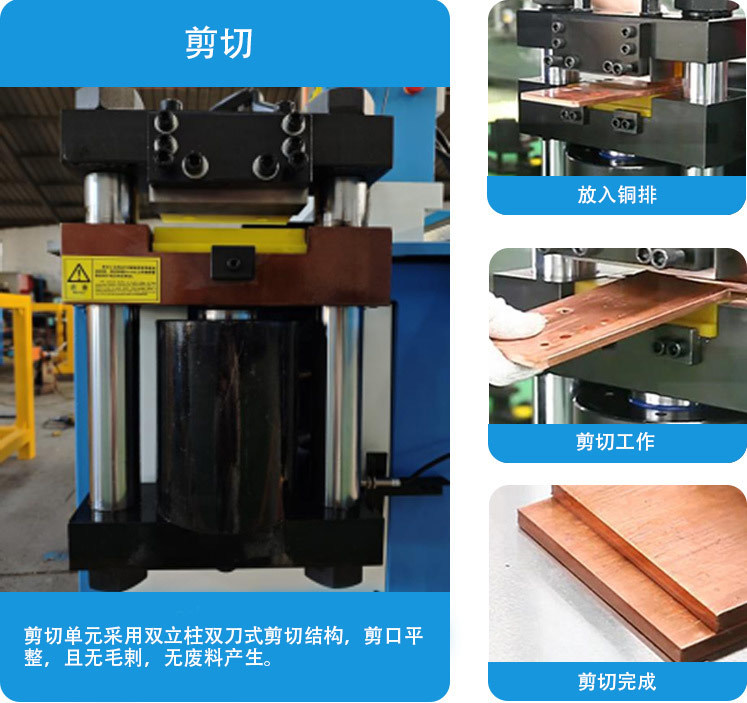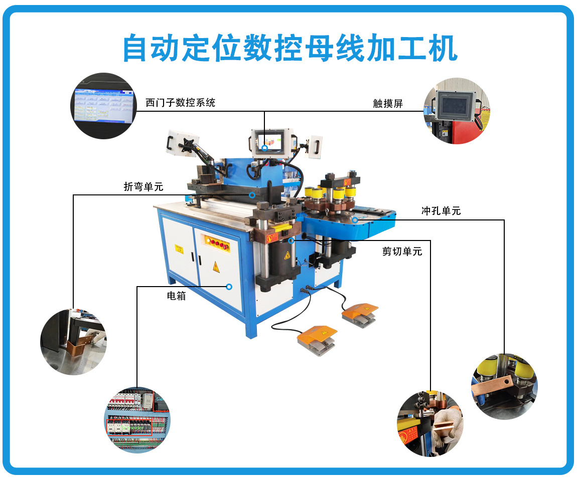 | 配有自动加油功能。采用三台电机,分别对应冲孔、剪切和折弯位,确保三工位功率稳定,各司其职,互不干扰。 | 折弯单元标尺采用激光雕刻,工作时不会对铜排底部因磨擦产生损伤 |